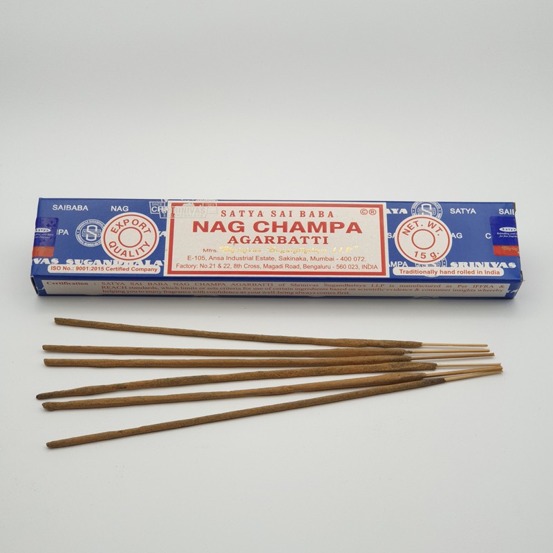 - Varillas de incienso Nag Champa Sathya, se presenta en cajas de 15 gr. con unas 20 unidades aproximadamente.