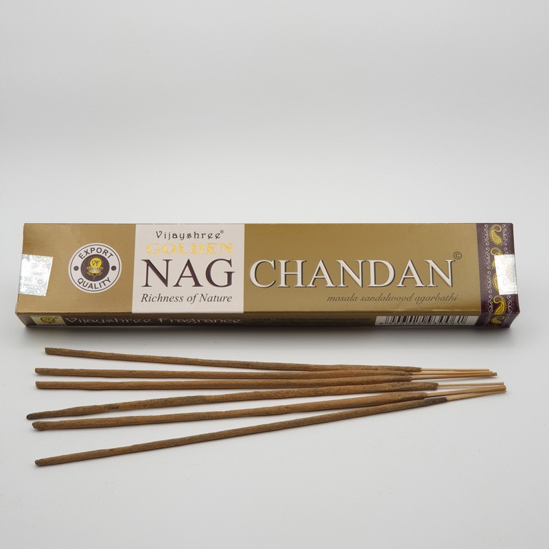 - Varillas de incienso de Golden Nag Chandan, se presenta en cajas de 15 gr. con unas 20 unidades aproximadamente.