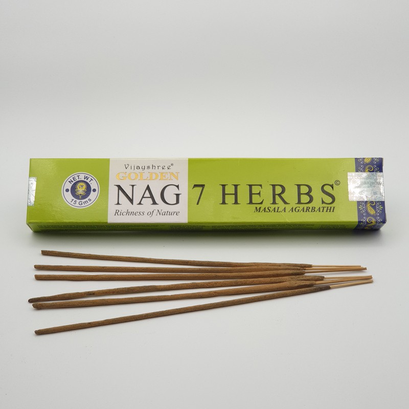 - Varillas de incienso Golden Nag 7 Hierbas, se presenta en cajas de 15 gr. con unas 20 unidades aproximadamente.