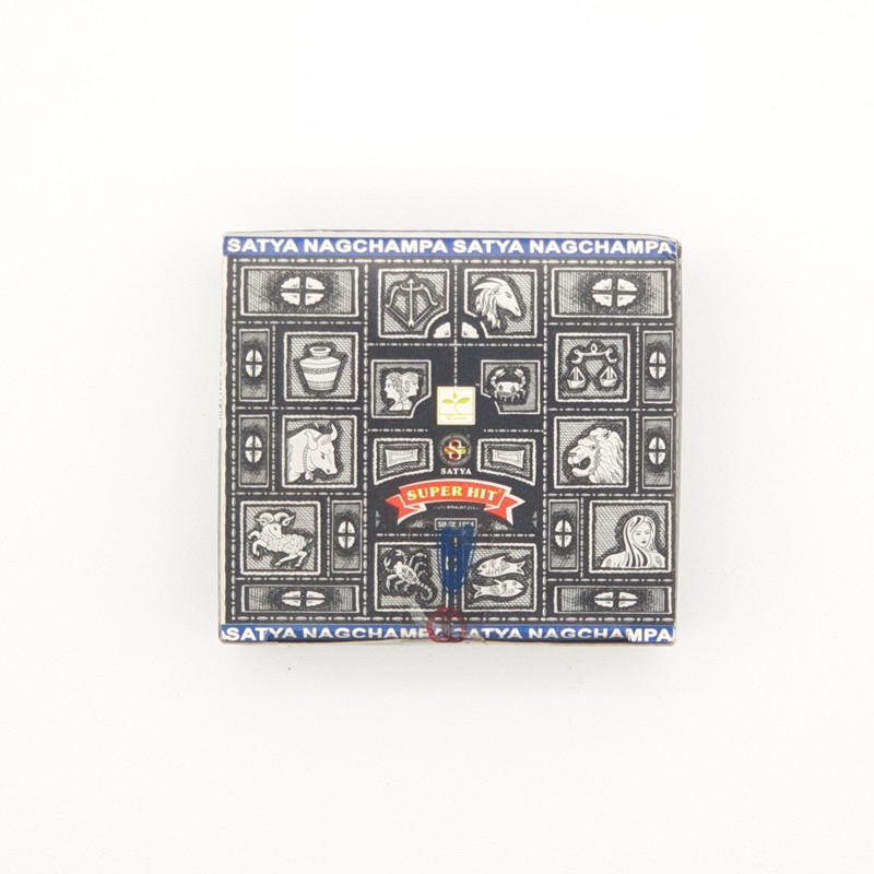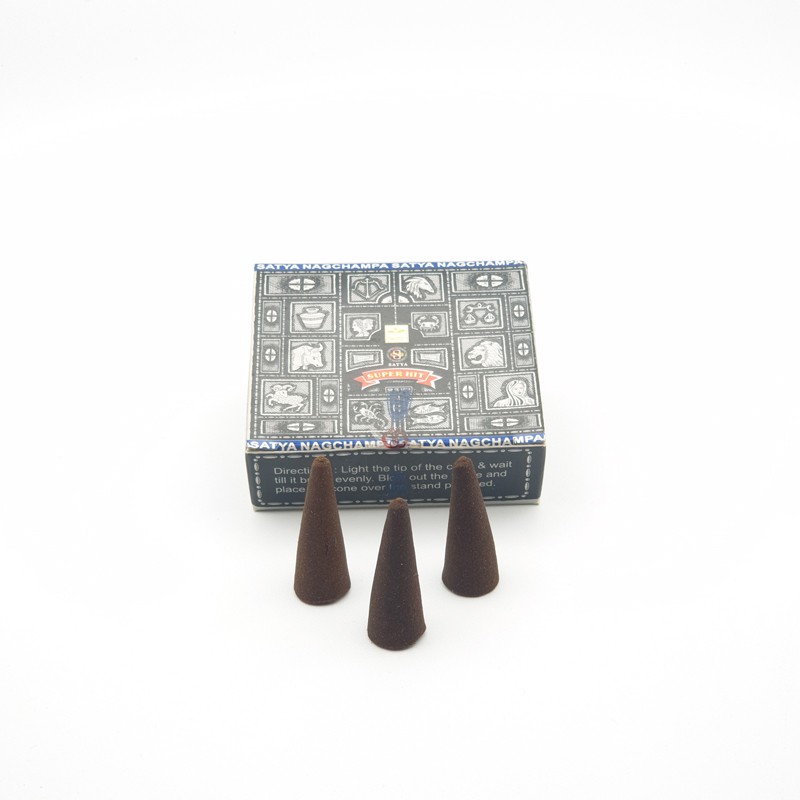 Cono de incienso de aroma Nag Champa Super hit, se presenta en caja de 12 unidades (aprox.).